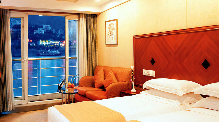 所有客房均为带阳台标准双人观景客房,配备观赏江景的私家阳台(阳台面积3平米左右),受到空间限制游轮客房不能与陆地酒店客房媲美。房间内带独立卫生间、马桶齐备,提供洗浴热水、中央空调、客房电话。为鼓励绿色环保,游轮及陆地酒店将不主动提供一次性洗漱用品,如有需要可至前台申领。